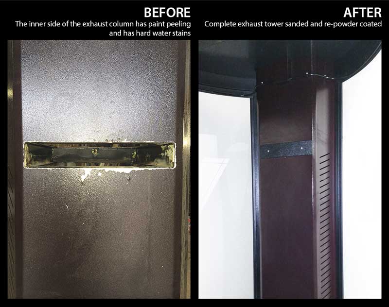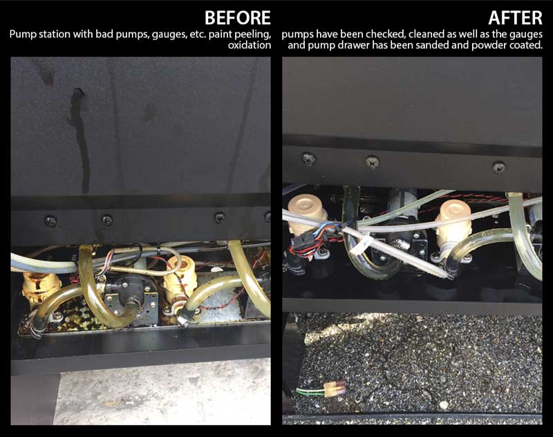 We repaint all metal parts, replace pumps and motors, add heaters and dryers, and update the software with the latest upgrade to run everything smoothly.